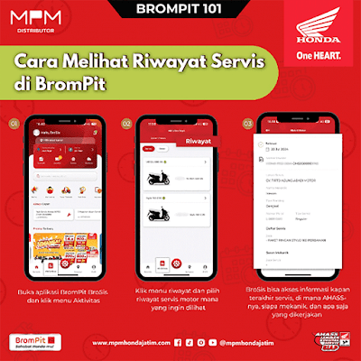 Selain memberi kemudahan booking service tanpa antri untuk konsumen Honda, aplikasi Brompit besutan MPM Honda Jatim ini juga memberikan kemudahan bagi penggunanya yang seringkali lupa kapan terakhir kali melakukan servis motor kesayangannya.